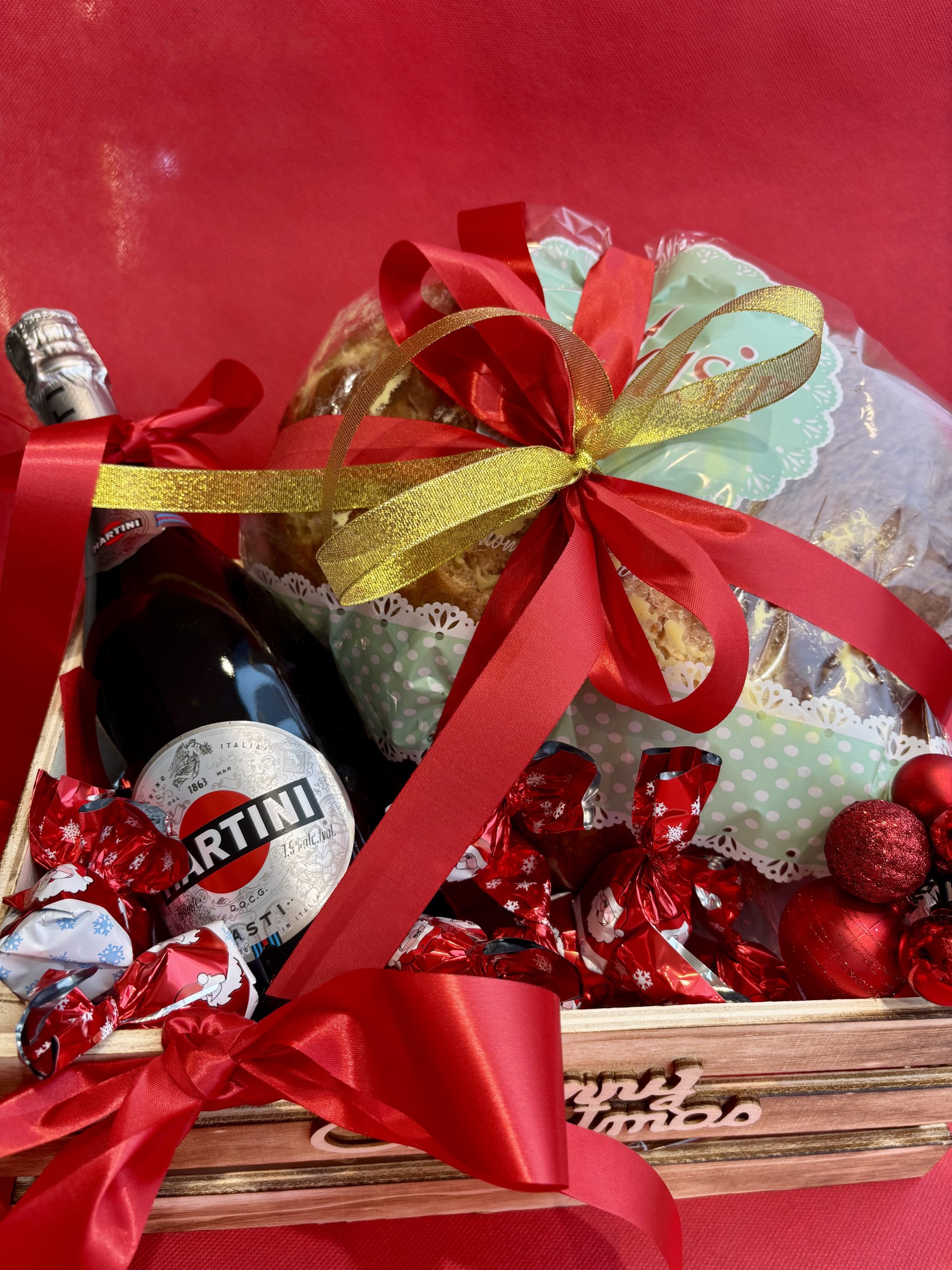 Κόκκινο κουτί πολυτελείας με κόκκινο ή λευκό κρασί Παράγκα, κουτί μελομακάρονα 500 γρ., βαζάκι με σοκολατάκια 250 γρ., πραλίνες τυλιχτές, γκι και χριστουγεννιάτικη μπάλα