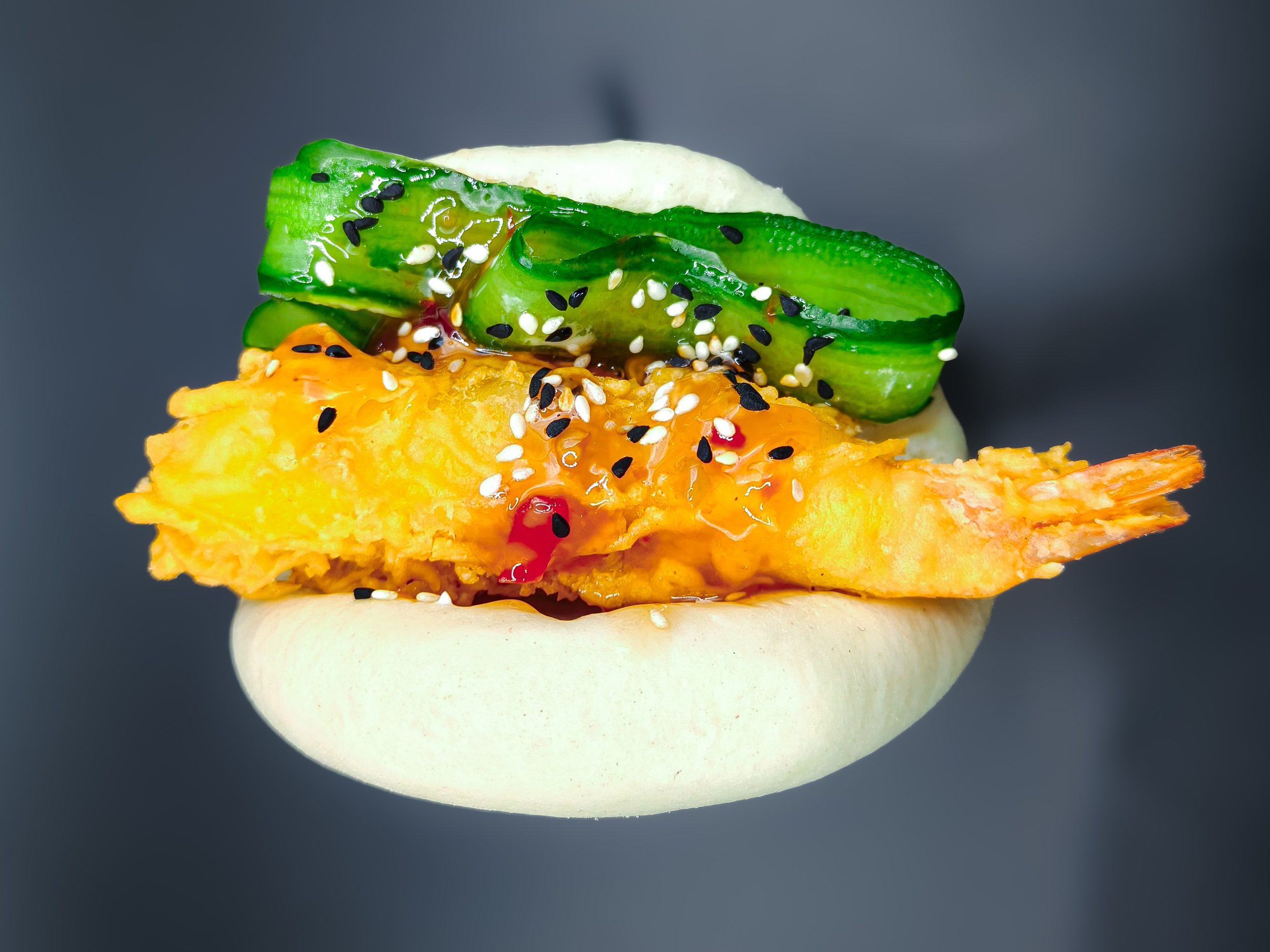 Bao bun με γαρίδα tempura,sweet chili sauce,flakes αγγουριού & γουακαμόλε